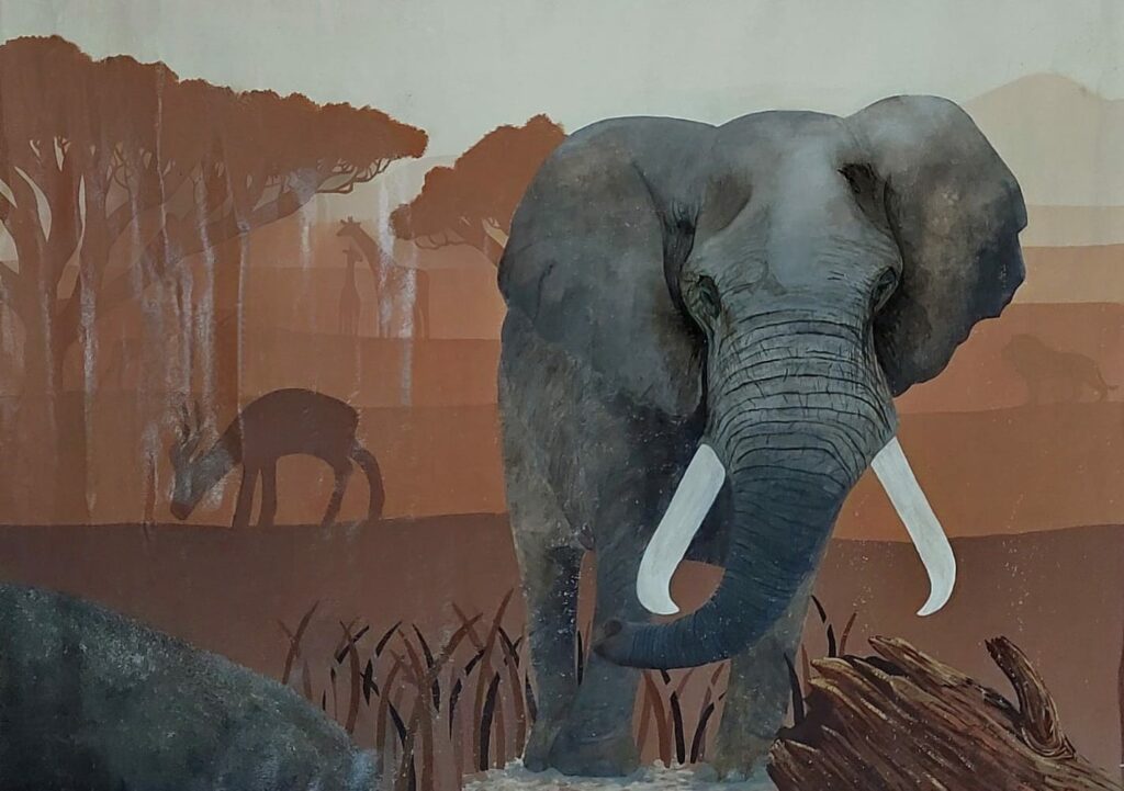 Au premier plan, un éléphant avance avec douceur et puissance, imposant une présence calme et majestueuse.