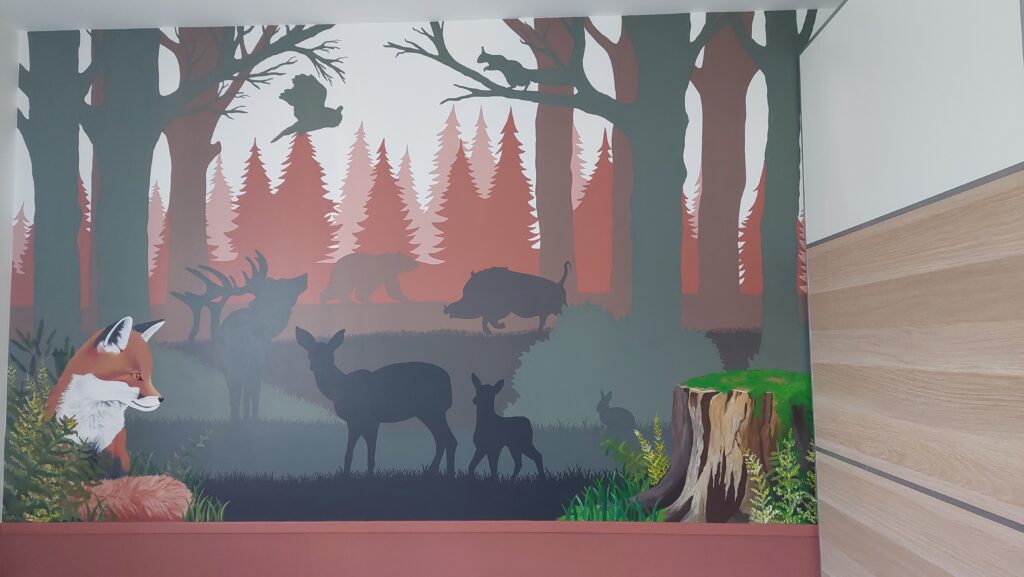 Une fresque forestière peinte à la main qui installe une ambiance calme, chaleureuse et réconfortante, comme une fenêtre ouverte sur la nature.
